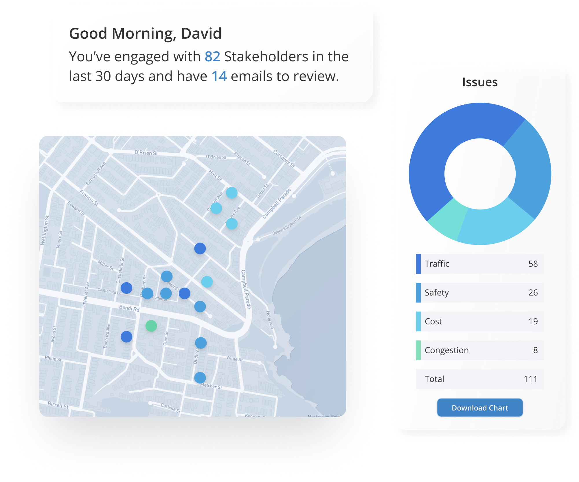 Geographic filters and segmentation: Target outreach by corridor, impact zone, or stakeholder cohort to deliver precise, relevant communications and engagement.